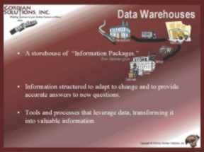 The computer industry has since 1991 been employing these principles in a retail oriented data management approach that we call Data Warehousing. Perhaps the best definition of a data warehouse that I could think of when preparing this topic is also the most terse. A data warehouse is a storehouse of Information Packages. The term Information Package was first coined by a Sybase consultant named Tom Hammergren shortly after data warehousing became popular. I liked Tom's idea of packaging information, and his notion has stuck with me ever since. |