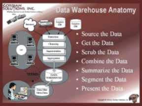 If we were to dissect a data warehouse--to examine its anatomy so to speak, we would see something like that depicted on the left of this slide. Lots of data manufacturers produce data. The warehouse is stocked with data from multiple data sources. An extraction process obtains the data from all these data sources and places it into a staging area. Because the data comes from so many sources it seldom looks the same. Consequently, the data must be scrubbed and cleaned up so that it can be combined. Once combined, the data represents quite a vast storehouse of knowledge, but it only in a raw state. To provide quick answers it must be combined. Averages and totals are pre-calculated in a step called aggregation. This aggregated data is next organized for fast and easy retrieval. |