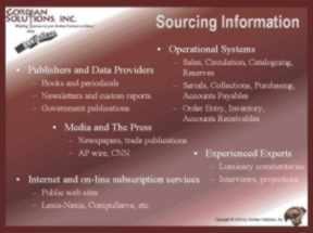 Next, you might turn to the press. Here you would examine newspapers, trade publications, the associated press wire feed and news sources like CNN. You might next turn to the Internet and on-line subscription sources. Here you would source data from competitor web sites, industry web sites and sources like Lexis-Nexis and CompuServe. Finally, you might turn to private sources of information and seek the advice of industry watchers, luminaries and consultants.