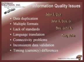 Take a common person's name. One system might accept the data like John A. Doe. Two people entering in the same person might come up with John A. Doe and John A. Doe, Jr. for the same person. Similarly, another system might prefer the last name first as Doe, John A. and be entered by a person in a hurry as Doe, John. Seems innocent enough, until you ask a computer to treat all these as the same John Doe.