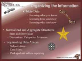Assume that you overcome these problems. How do you organize the information? Better yet, how do you know what you have? How would you know what you have in a warehouse? Take inventory. When you take inventory in a data warehouse, you record the answers in a meta-data repository. Meta-data is simply a clever term for data about data. It's a way of knowing what you know, knowing how you know what you know and knowing why you know what you know. Clearly, if you know this then you know what types of questions that you are capable of answering within the data warehouse. |
