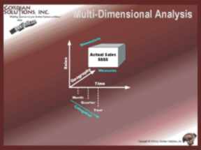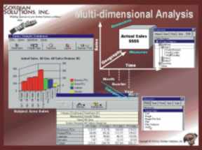 Three additional terms surface when building a data warehouse. These are dimensions, categories and measures. Although we shall cover these shortly it is best to just understand that these are merely terms for processes that you already perform when researching the answer to a particular question. In the same way that you organize your research results, data warehousing practitioners organize dimensions, categories and measures. Just as you must service many customers, so must a data warehouse. Specificity enables you to segment your search to various aspects of a subject area. Similarly, data warehouses segment user access by subject area. Each subject area may have its own unique vocabulary. For this and performance reasons data warehouses segment access to the data in different subject areas into Data Marts. A data mart is a specialty retail store--a boutique--that sells data related to one kind of subject area, like sales or manufacturing. Data warehouses segment their data via packaged reports or access to specific subsets of data used to create ad-hoc reports. Over the years experience with data warehouses has led developers to a few proven ways of presenting data to users. By far the most popular is through data visualization tools. Data visualization tools allow users to explore a virtual data space. Like true space, data space is multi-dimensional. Each dimension in this virtual information space represents a different aspect of the subject being explored. Users have the ability to drill down to more detail or drill-up for a high level view. This ability to drill down and drill up was first introduced with spreadsheets and early Executive Information Systems. As tools progressed, the ability to visualize data in more ways than charts and graphs became important. People began plotting data on maps. This gave rise to geographic information systems or GIS for short. Multi-dimensional tools have evolved to what are now termed On-line Analytical Processing system or OLAP systems, whereas GIS has evolved into a specialty field of its own. Vendors have emerged and introduced their own vernacular so as to confuse the competition. So, you may run into phrases like ROLAP and MOLAP as well as DOLAP that all mean the same thing. |