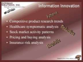 What do I mean by Information Innovation? Let's look at some examples. Examining a whole industry and determining competitive product research trends is innovative. How about looking at dozens of symptoms to be able to predict who will have the next heart attack? That's pretty innovative. For those more financially motivated, we can seek patterns of activity in the stock market. We could analyze price elasticity and set better prices for our products and services. You might be in insurance and want to know if the last person you signed is a good risk. These are all innovative uses of technology. They are also very very hard to do. |