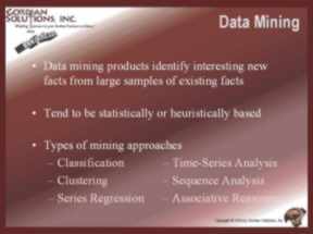 Next, and similar to classification, comes clustering. In clustering, products look at the frequency distribution of data values and determine natural cluster points for values. These cluster points form interesting starting points from which many useful new insights typically arise. In addition to frequency distribution, data mining products also employ other statistical techniques. Some look at series regression using the same techniques taught to first year MBA students. Other product specialize in analyzing series over time. Still others combine values derived from multiple events over time. These sequence analysis products produce useful insights but require high skill operators. Finally, there are the pure associative reasoning engines that apply decision trees and neural networks to seek interesting patterns in data. Dozens of data products are currently on the market. All claim to be better in some ways than other products. I would recommend paying the vendor to develop an example mining scenario prior to full deployment. Not every product will work well for every situation. |
