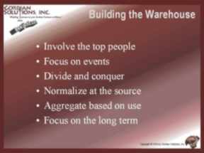 While I am on the topic of recommendations, perhaps I should digress and cover some specific recommendations for building data warehouses. In building your data warehouse it is absolutely essential that you involve the top people. Data warehouses cut across organizational boundaries and get very political very quickly. In determining which subject areas to attack, focus on critical business events. These typically manifest themselves as transactions, but need not. For instance, in a competitive information system, you might choose to focus on competitive press events and public disclosures. Focus, however, is key. Divide the project into manageable pieces. Begin by answering the ten top business questions. Resist the temptation to please everyone at once.