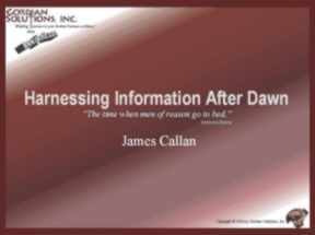 I hope that you have enjoyed this ride and have some questions for me. Again, I am James Callan and I am confident that you can apply these ideas for Harnessing Information After Dawn. Ladies and gentleman, Lois thank you very much. |