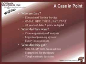 My case in point comes from an engagement in Princeton, New Jersey that I completed last year. It was with a company called Educational Testing Service. Those of you unfamiliar with the education industry will recognize ETS by their products and services. They administrate the GMAT, GRE, TOEFL, SAT and PSAT tests as well as many others. Worldwide, they are the largest assessment organization. They have been at it about 40 years and have about five years worth of purely digital records for virtually every college graduate in Generation X. |