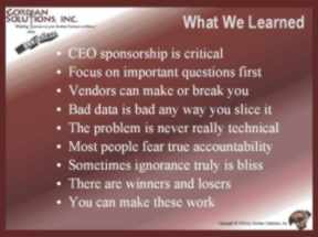 We also learned that vendors can ruin a project. I will not mention these vendors' names because at least one is represented at this conference. Let me just say buyer be careful. We also learned that bad data is bad any way you slice it. This is a real business issue. Technology just makes it pretty. Speaking of technology, the problem is never really technical. It is always a business problem--usually a people problem. Data warehouses bring out people's worst fears. Most people fear true accountability. We also found that some managers do not want their peers poking around in their data. Sometimes ignorance truly is bliss. You cannot please everyone. There will be winners and losers. This is why focus is important. However, you can make these things work for you and your organizations. | ||