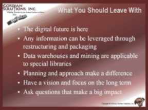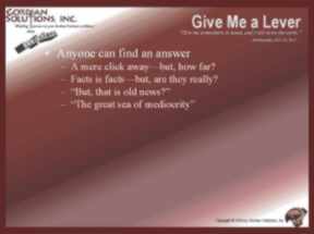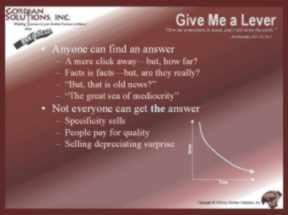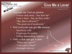 Archimedes, a Greek who used to spend a lot of time in bathtubs, once said, "Give me a place to stand and I will move the earth." Archimedes, when not sitting in bathtubs and running around Greece with only a towel, studied levers. He was talking about leverage. What I am talking about is information leverage. In an era when anyone can get answers a mere click away, how can we as Information Providers leverage information? | |