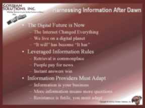 Information is your business. For that matter, information is my business. In the dawn of this new age, information from all sources is accumulating at an alarming rate. More information means more questions. More questions means that you and I must find more answers. We must adapt. Information providers must adapt. We have no choice. Resistance is futile. You must adapt, and today I want to talk about how to adapt. |
