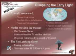 Ladies and gentleman its a real pleasure to speak with you today on a topic that you should find stimulating. I have entitled todays topic, Harnessing Information After Dawn. Ambrose Bierce called the dawn the time when men of reason go to bed. Being a writer myself, I can identify with a late night or two. However, I think that after today you will agree that the dawn is when information can best be harnessed. But doing so today, unlike in Bierce's day, demands unreasonable men, and women. | |