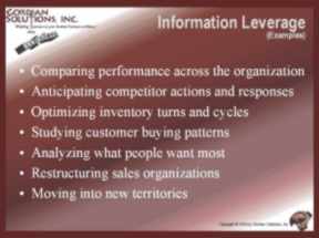 What do I mean by information leverage? Let's look at a few examples. Information leverage is when you can compare the performance across the organization or when you can anticipate a competitors' actions and responses to your actions. It's when you can optimize your inventory turns or cycles or when you want to study customer behavior and buying patterns. It's when you want to analyze what people want most. Now, that's valuable. Leverage is when you need information to decide how to restructure your sales organization and prepare to move into new territories. It is times like these when quality information delivered quickly provides leverage. | |