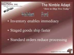Sam Walton, the founder of Wal-Mart and until he died one of the wealthiest men in America, after years in retailing discovered that inventory enables immediacy. If you have the goods on hand, then you do not have far to walk. He made sure that he always had goods when people wanted to buy them. Sam also discovered that if you stage the goods, you can ship them faster. This he employed in his Sam's Clubs and in his distribution centers. Ever walk through a Sam's Club and see goods resting on pallets? These are staged goods.